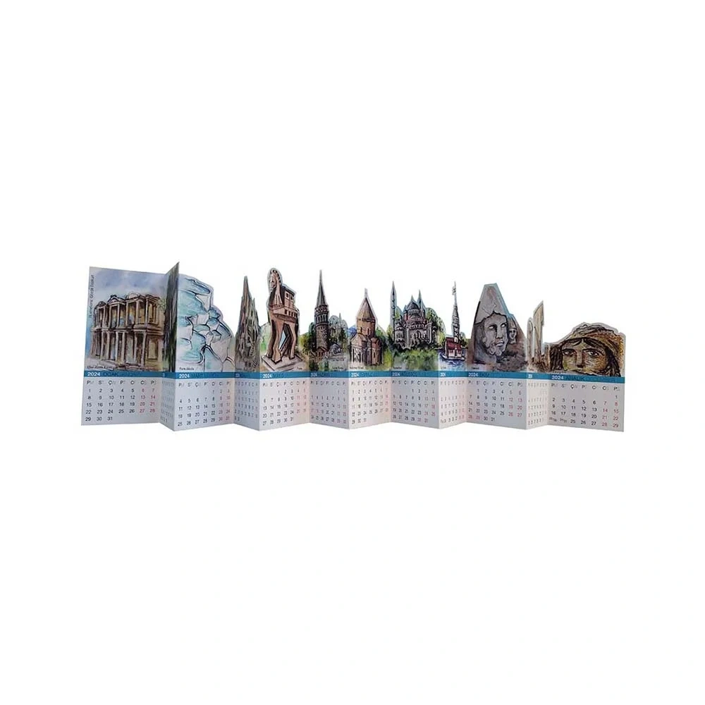 2023 - 2024 yıllarını içeren özel bıçak kesimli, dekoratif ve kullanışlı akordeon masa takvimlerimiz; üç farklı desenle beğeninize sunulmuştur.