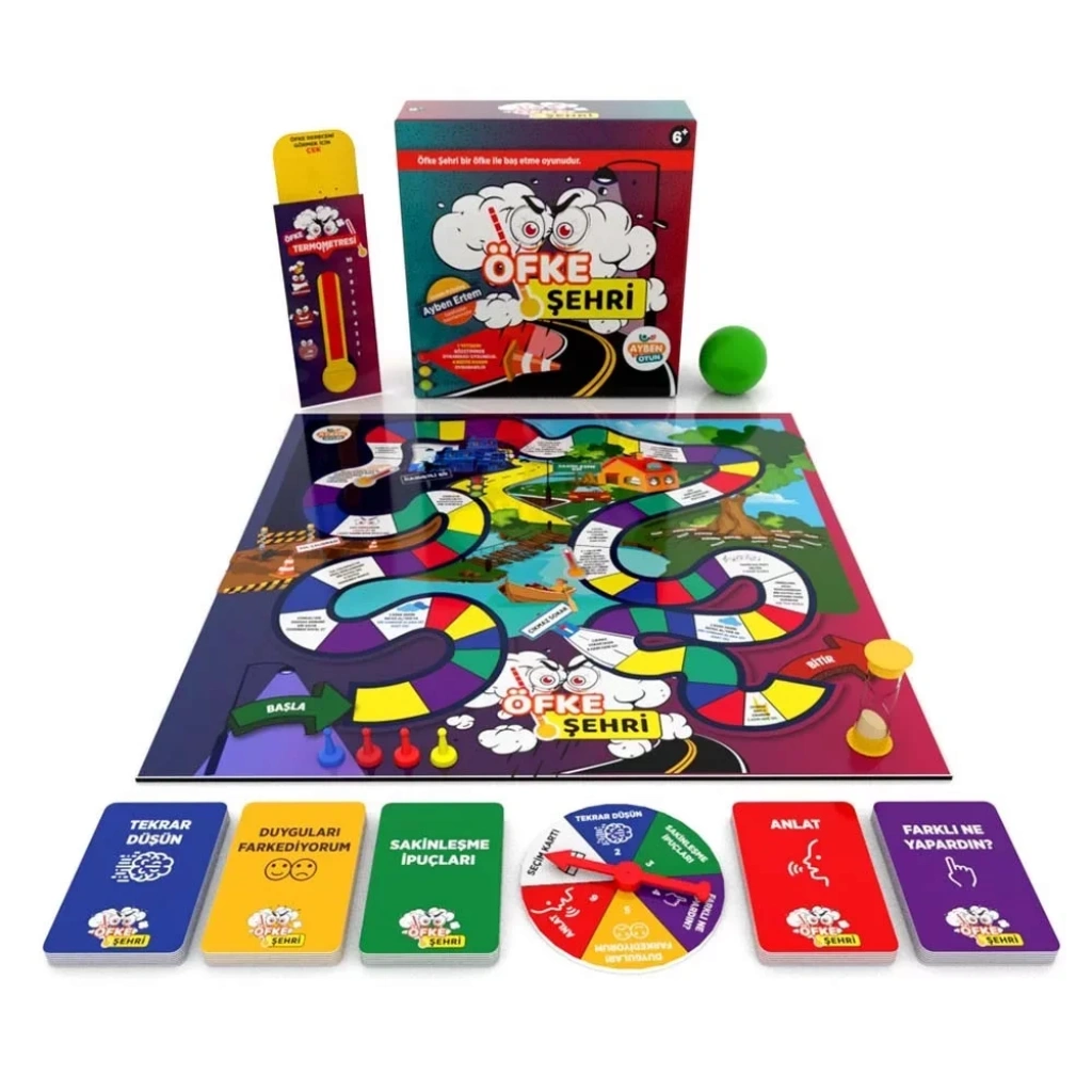 Oyun İçeriği : Oyun panosu, 5 çeşit 128 adet kart, 1 dakikalık kum saati, 1 stres topu, kartları belirleyici çark, öfke termometresi, 4 adet piyon içerir.