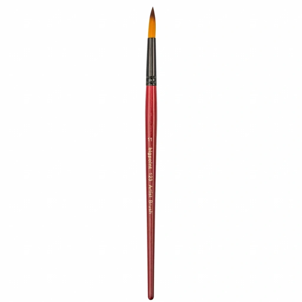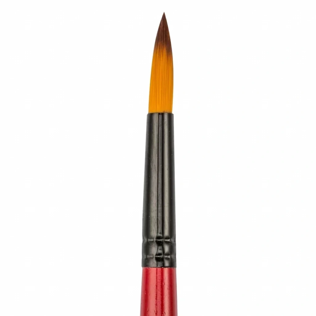 123 Serisi Sentetik Kıl Yuvarlak Fırça Numara: 11 Kaliteli golden with brown tip(altın renkli, kahverenkli uçlu) sentetik kıldan üretilmiştir. Suluboya, guaj boya, akrilik boya, cam boyası, kumaş boyası, seramik boyası, porselen boyası, tahta boyası ve ipek boyası için idealdir. Su tutma ve boya depolama kapasitesi yüksektir. Fırça kılı ile vernikli bordo ahşap sapı birleştiren kısım siyah alüminyumdan yapılmıştır.