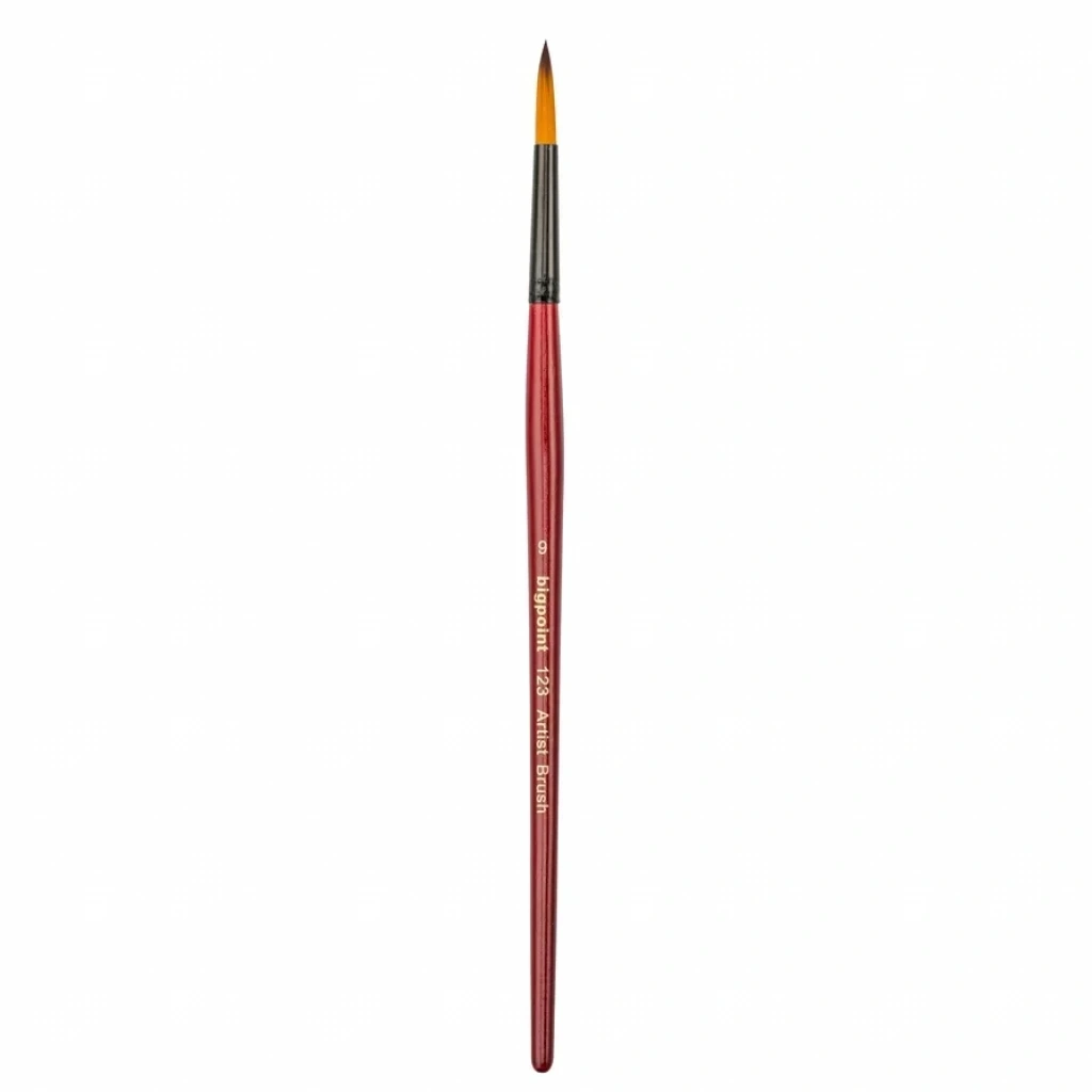 123 Serisi Sentetik Kıl Yuvarlak Fırça Numara: 9 Kaliteli golden with brown tip(altın renkli, kahverenkli uçlu) sentetik kıldan üretilmiştir. Suluboya, guaj boya, akrilik boya, cam boyası, kumaş boyası, seramik boyası, porselen boyası, tahta boyası ve ipek boyası için idealdir. Su tutma ve boya depolama kapasitesi yüksektir. Fırça kılı ile vernikli bordo ahşap sapı birleştiren kısım siyah alüminyumdan yapılmıştır.