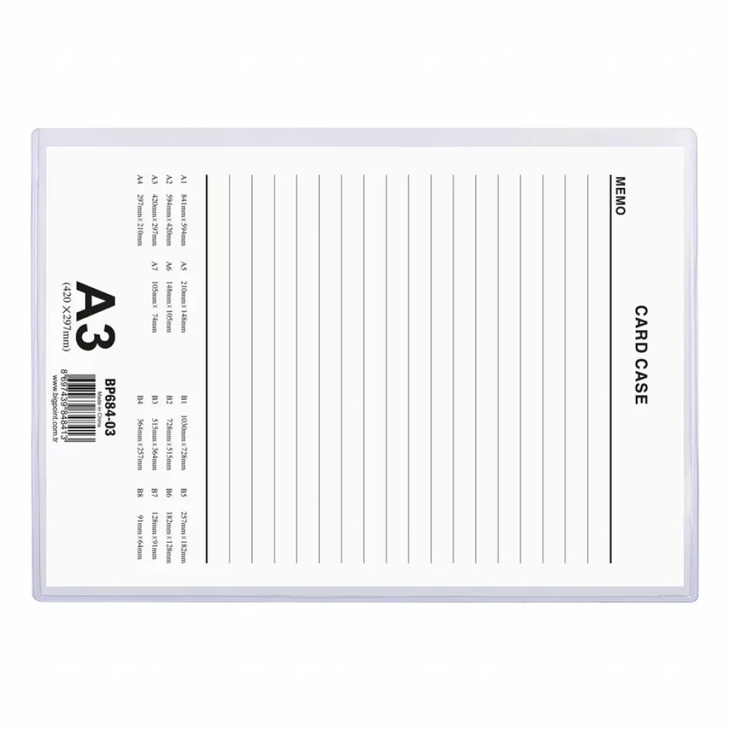 İç kağıt ölçüsü: Yatay A3 (420x297mm) Kalınlık: 0.35mm Şeffaf PVC plastikden üretilmiştir, yarı yumuşaktır. Arka yüzeyindeki iki çivi deliğiyle duvara monte edebilirsiniz. Üstten kolay kağıt/kart geçirmeli sistemi sayesinde pratik kullanım. EN71 testleri yapılmıştır.
