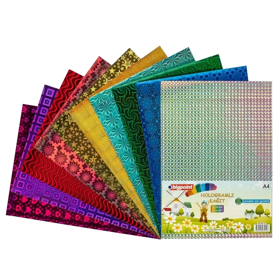 A4 ebadındaki hologramlı kağıtlar 10 farklı renk ve desendedir. 80 gr/m² kağıt üzerine özel tutkal ile hologramlı selefon sıvanmıştır. Kağıt üstündeki hologramlı selefon birbirinden ayrılmaz ve elişi derslerine uygundur. Çocuklar için güvenlidir, EN71 testlerinden geçmiştir.