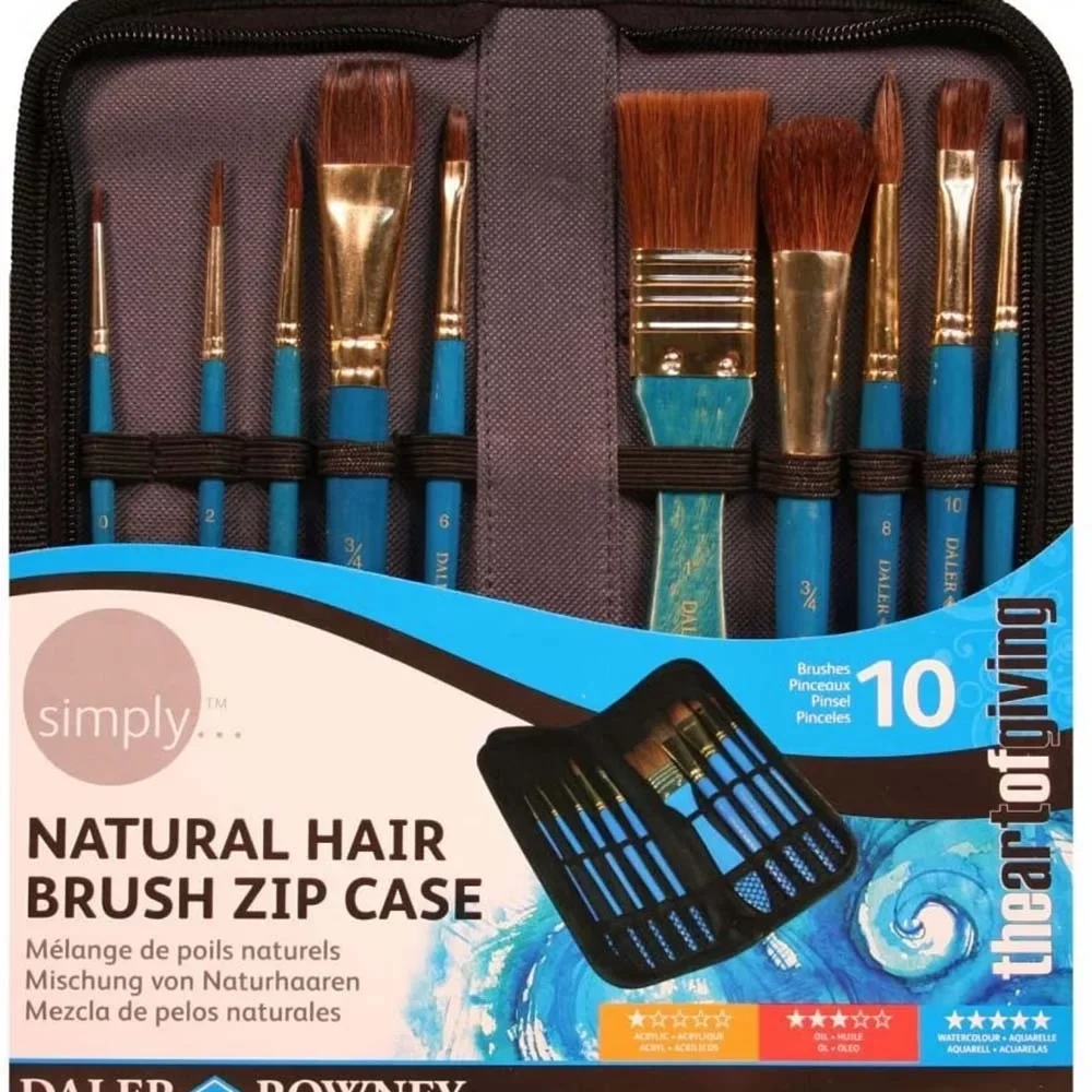 Daler-Rowney Simply Watercolor Brushes, neredeyse her ihtiyaca uyacak şekilde çeşitli şekil ve boyutlarda doğal saçtan yapılmıştır. Fermuarlı çantalıdır. Doğal saç.Suluboya için ideal. Yağlı boya için de kullanılabilir.Yeni başlayanlar ve hobiler için önerilir. Yuvarlak uçlu: 0, 2, 4 ve 8 numara, Kedi dili: 6 numara Düz göglendirici: 4 ve 10 numara Düz bulandırıcı: 3/4 inch (1,90 cm genişliğinde) Oval bulandırıcı: 3/4 inch (1,90 cm genişliğinde) Skyflow: 1 inch (2,54 cm genişliğinde)