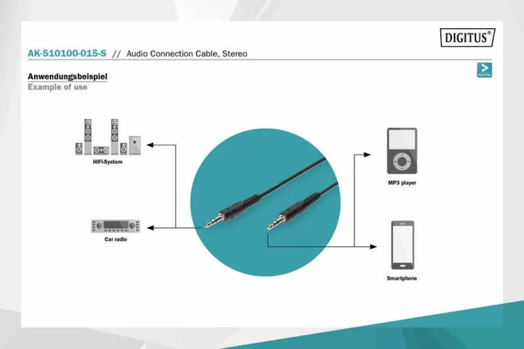 Örneğin MP3 çaların veya akıllı telefonun HiFi Sistemine veya araç radyonuzun stereo arayüzüne bağlanması için 3,5 mm stereo kablo.
