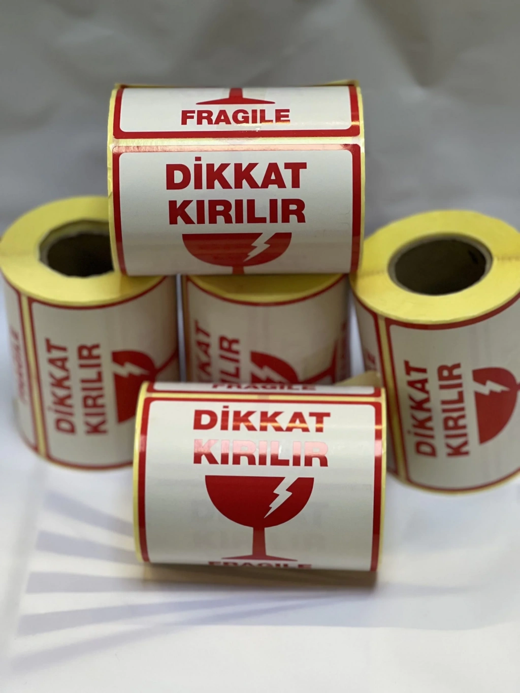 100 mm x 100 mm. ölçülerinde kuşe kağıttan, ”Dikkat Kırılır” yazılı ikaz-uyarı ürünüdür. Sağlam yapışkanlı, koli, karton, poşet vb. her yüzeye kolayca yapışabilir. 1 ruloda 250 adet etiket vardır.