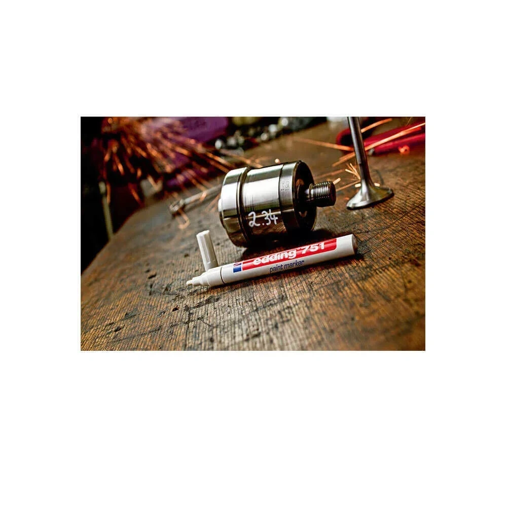 İşletmelerin işi bittiğinde, edding 751 tam örtücü boya kaleminin son derece opak mürekkebi parlayacaktır - çünkü,tüm renkler 400 ° C'ye kadar ısıya dayanıklıdır, bazıları ise 1000° C'ye kadar dayanıklıdır. Belirsiz koşullar altında bile, bu edding görevlerini yerine getirmeyi garanti eder.