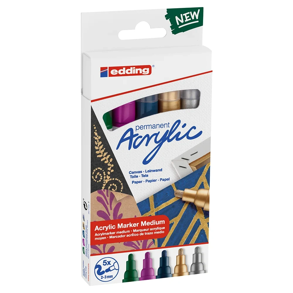 Resim yapan herkes, bu akrilik boya markörleri ile malzemelerine güç katar. Bir markör gibi şekillendirilmiş olan bu akrilik boyanın kullanımı, tüp içinde kullanılan geleneksel akrilik boyanın kullanımına göre çok daha kolaydır. Valf sistemi sayesinde, boyayı yüzeye doğrudan uygulayabildiğiniz gibi, eşit bir akış elde edebilirsiniz. Hassas ve sorunsuz bir şekilde uygulanır, doğal yaratıcılığa olanak tanır. Orta genişlikteki uç kalınlığı, çizgilerin dikkatli bir şekilde kontrol edilmesine olanak sağlar ve bu sayede çeşitli motifler üretebilirsiniz. Tuval üzerine çalışılan ayrıntılı sanat eserlerinden tebrik kartları üzerinde çizilen resimlere kadar pek çok farklı kullanım alanına sahiptir. İpucu: renkler birbiriyle karıştırılabilir veya kat kat uygulanabilir. Bu akrilik markörler edding 5200 permanent sprey ile de uyumludur, örneğin bir tuvalin yüzeyini boyamak için spreyleri kullanabilirsiniz. Sprey boya kuruduktan sonra üzerine akrilik kalemler kullanılarak çizim yapılabilir. Her iki ürün türüne ait renkler birbiriyle son derece uyumludur. İlk kullanım öncesinde, markör şu şekilde aktif hale getirilmelidir: İlk önce, kapak takılı vaziyetteyken markörü kuvvetlice sallayın, ardından kapağı çıkarın. Ucu aşağı bakacak şekilde iken kalemi bir kağıt üzerine bastırın ve mürekkep kalemin ucuna doluncaya kadar kağıt üzerinde birkaç kez dikkatlice aşağı yukarı bastırın. Markör artık kullanıma hazırdır. Kapak, markörün arkasına takılabilir. Yatay olarak ve oda sıcaklığında (5-30 ° C) saklayın. Üstün kaliteli marka ürünü. Almanya'da üretilmiştir. Açık, koyu yüzeylerde kolay, doğal çizim için orta uçlu akrilik kalemler; neşeli desenler için son derece uyumlu, birbiriyle karıştırılabilir renkler. Set 5 adet akrilik markörden oluşmaktadır – yosun yeşili, orman meyvesi (mor), gece mavisi (koyu mavi), altın ve gümüş. Üstün kaliteli akrilik markör, su geçirmez, su bazlı pigment mürekkep; örtücü, ışığa dayanıklı ve kalıcı; temiz bir uygulama ve mat bir görünüm için. Sağlam, orta kalınlıkta yuvarlak uç, tuval üzerine hassas çizgiler ve şekiller çizmek için idealdir; yedek uçları mevcuttur