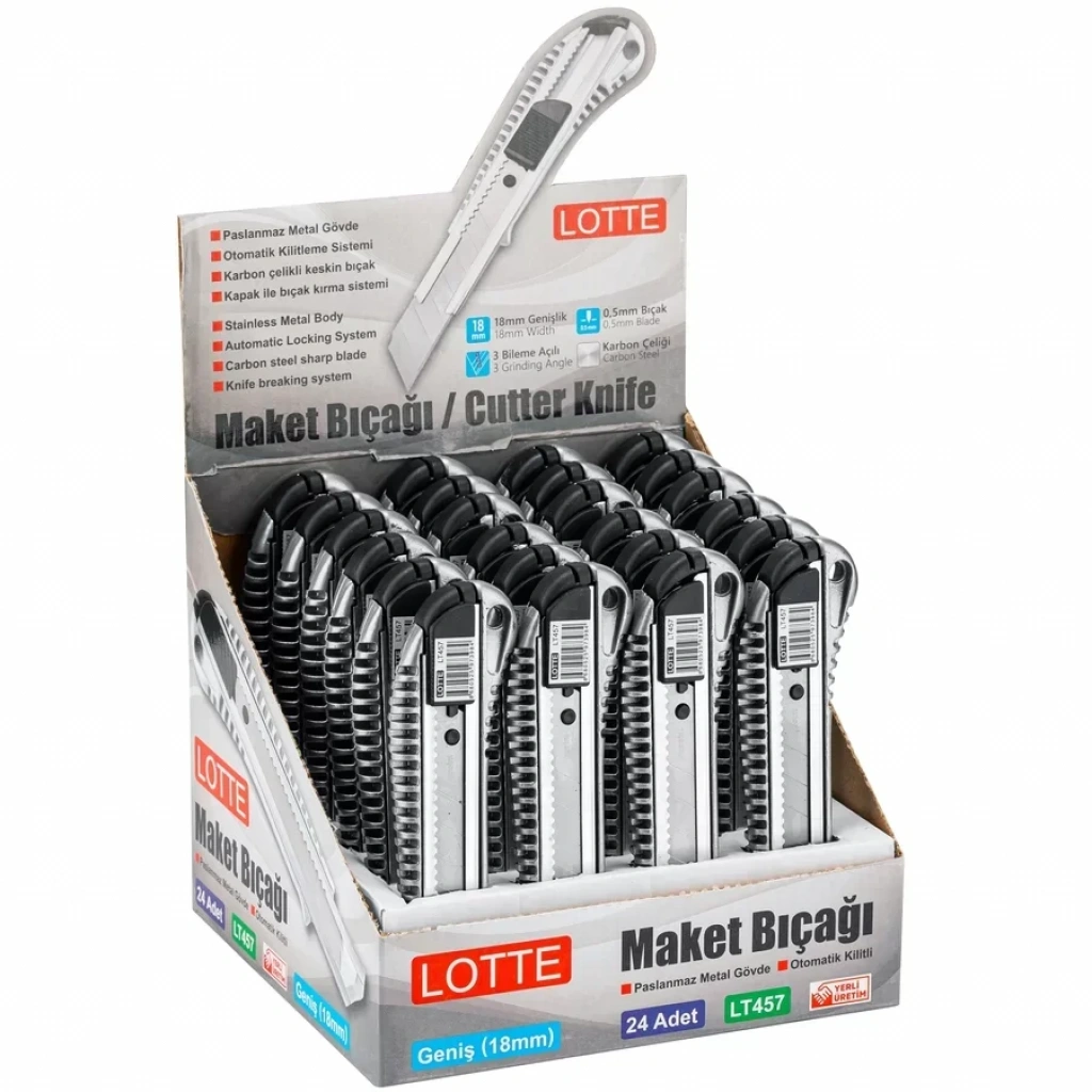 18 mm bıçak ağzı Bıçağı karbon çeliğinden üretilmiştir. Gövdesi dolgulu metalden üretilmiştir. Metal ağızı sayesinde kolay ve güvenli kesim. Körelen bıçağı kademeli kırmak için kapak arkası bıçak kırma sistemi. Kesim anında bıçağı sabitlemek için özel kilit sistemi.