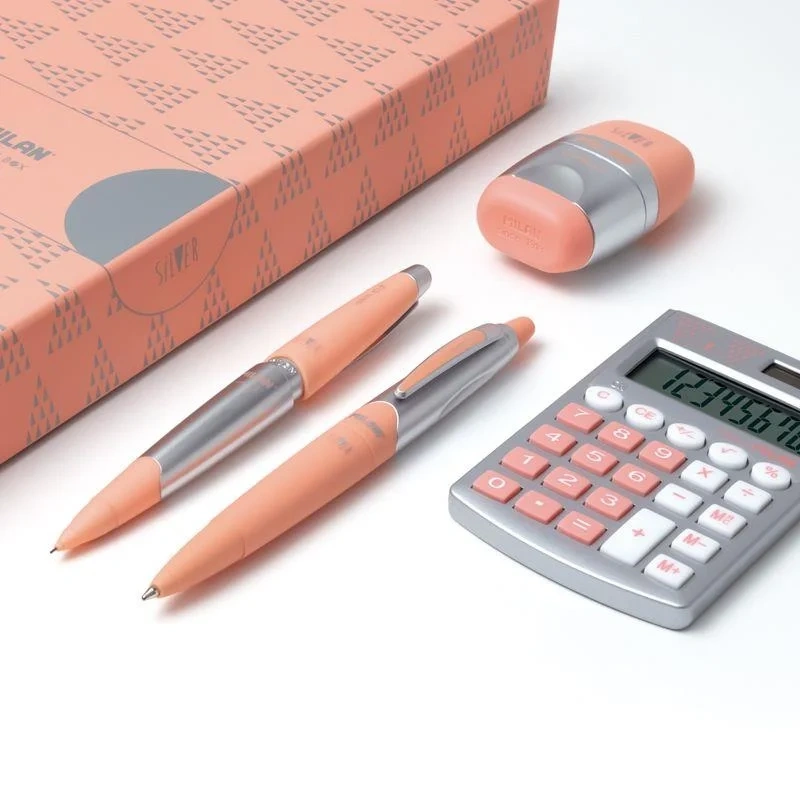 Milan Hediyelik Hesap Makinesi Tükenmez ve Kurşun Kalem Kalemtraş Set Gümüş Pembe